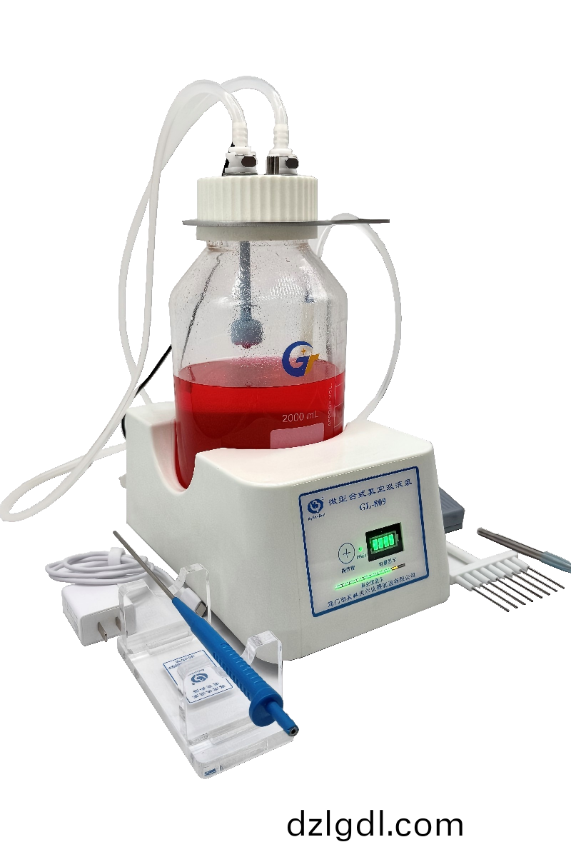 全新升级款GL-809微型台式真空吸液泵自带可充电锂电池,仪器配置快插接头、液位传感系统,瓶盖配备放气阀、真空度指示灯。仪器自带一键电路开关控制模式、脚踏开关控制模式。仪器配置2000ml废液瓶,使你工作更具可控性。